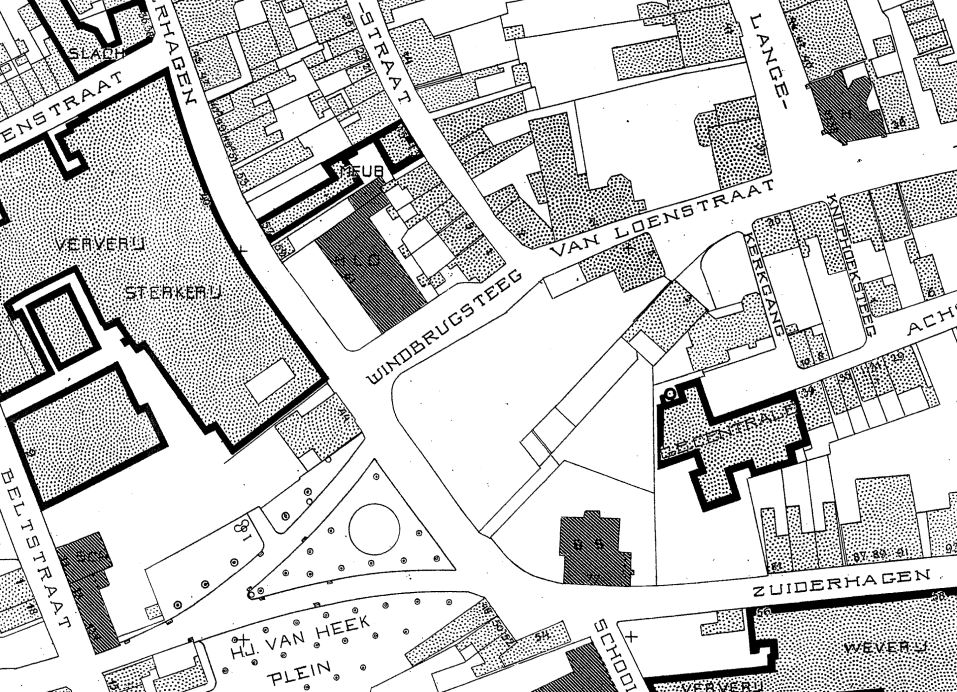 Arie zie de plattegrond van 1913 het pand stond midden op de Loenshofstraat en Windbrugsteeg.
