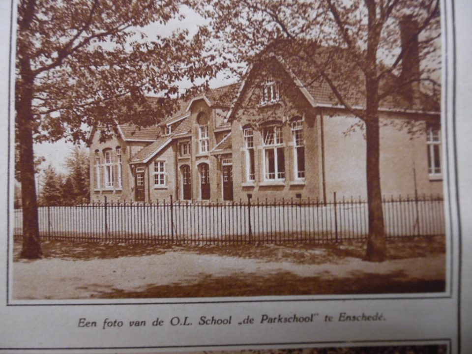Deze foto gevonden op facebook en komt uit uit het tijdschrift Eigen Erf. Een foto van de O.L. school "de Parkschool" te Enschede volgens het onderschrift. Weet iemand waar deze school heeft gestaan? Volgens opmerkingen in facebook kan dit niet Enschede zijn. Het is in ieder geval niet de Volksparkschool aan de Volksparksingel en Borstelweg, want die had geen grote ramen aan de voorkant.