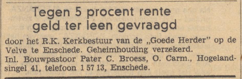 R.K. Kerkbestuur de Goede Herder bouwpastoor Pater C. Broess O. Carm. advertentie Tubantia 20-6-1965.