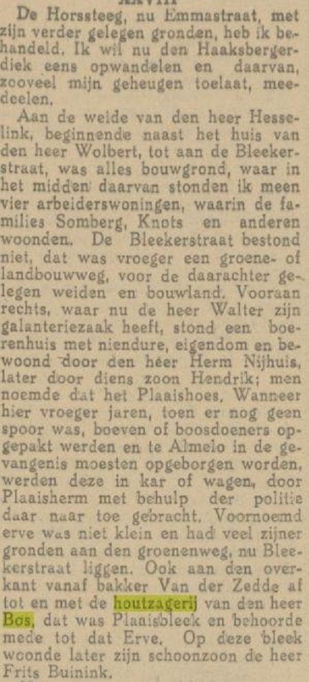 Ik heb van de houtzagerij van Bos niet veel informatie kunnen vinden. Wel onderstaand krantenbericht van 11-5-1923 waarin de houtzagerij Bos in de omgeving Bleekerstraat en Haaksbergerstraat wordt genoemd. Ook nog een hinderwetvergunning in de Tubantia van 4-3-1911 voor de heer G.J. Bos G. Jzn. tot het oprichten van eene door stoomkracht gedreven houtzagerij op het perceel aan den Haaksbergerweg.