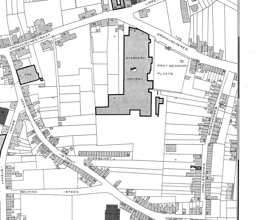 Ook op onderstaande kadastrale kaart van 1913 is de houtzagerij (omcirkeld) te zien in de omgeving Haaksbergerweg en Bleekerstraat.