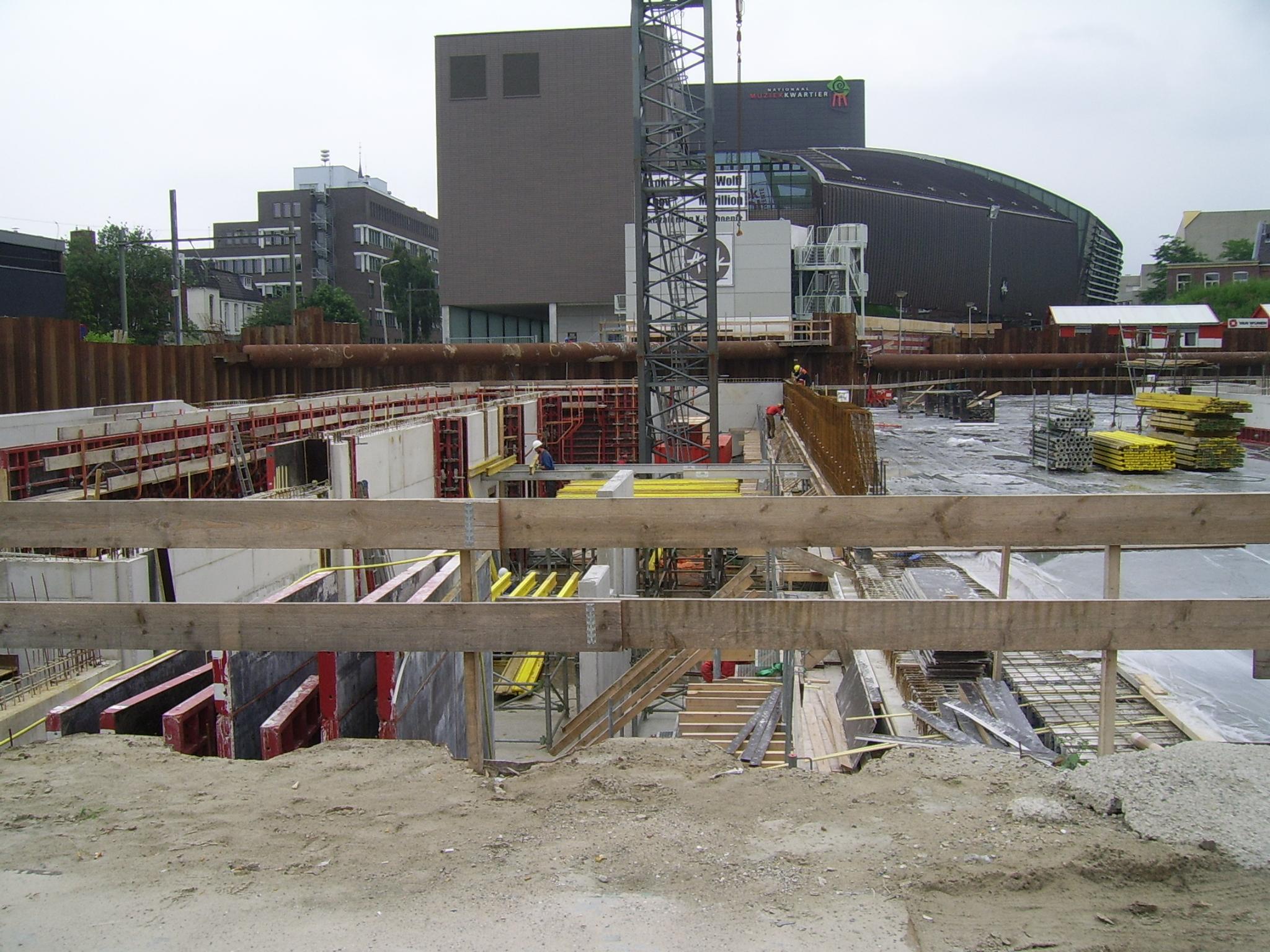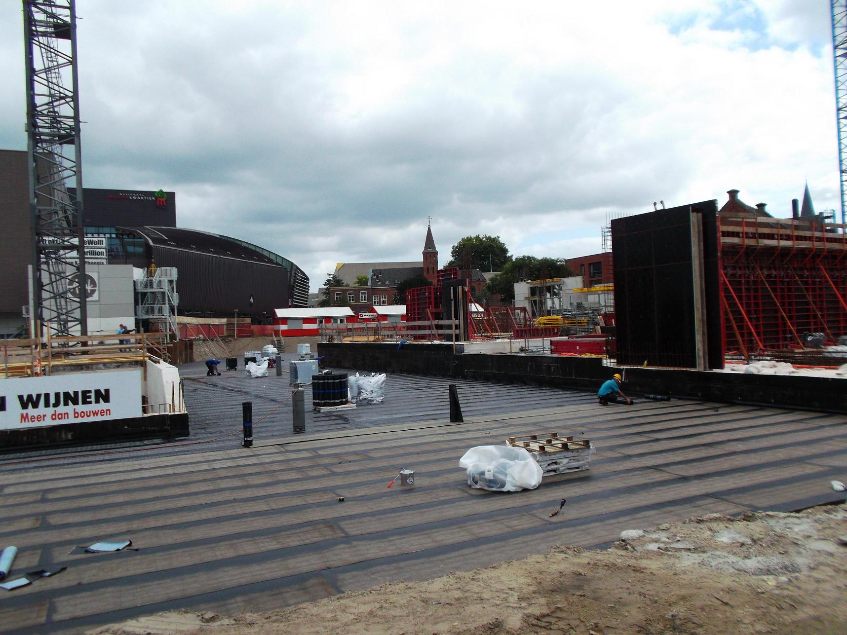 Waar de dakdekkers bezig zijn komt de doorgang naar het Willem Wilminkplein. Ik ben benieuwd als ze daar straks zand opstorten of er dan gelijk weer een doorgang voor het publiek naar het Muziekkwartier gemaakt wordt of dat we moeten wachten tot de volledige bouw voltooid is.
