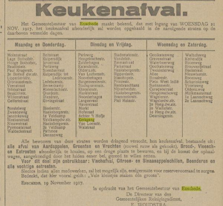 In een krantenbericht van 20-11-1917 (zie hieronder) werd de naam Kerkgang ook al eens genoemd. Opmerkelijk in dit krantenbericht is dat toen al een afvalscheiding plaatsvond en dus het keukenafval afzonderlijk werd opgehaald.