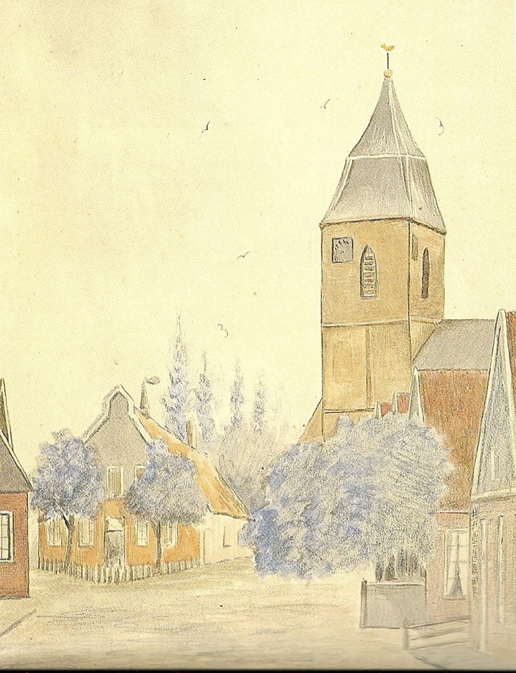 Langestraat richting Markt kerk tekening uit 1839. Ik heb niet kunnen achterhalen wie de vervaardiger van deze tekening is geweest.