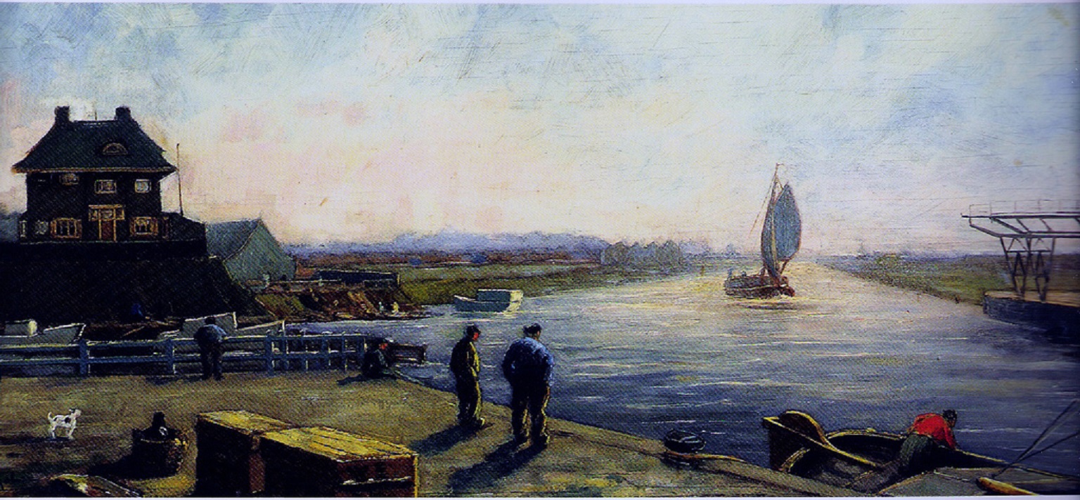 Ook dit is een schilderij van Krol uit 1936 van het Twentekanaal met de Haven van Enschede en links het gebouw van de havenmeester.