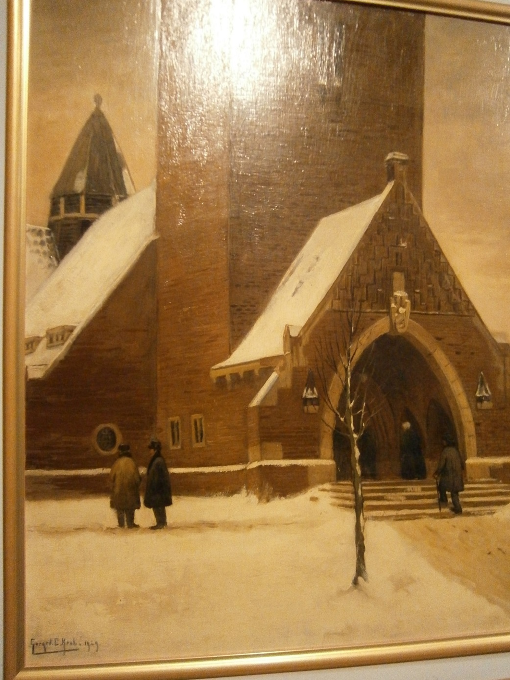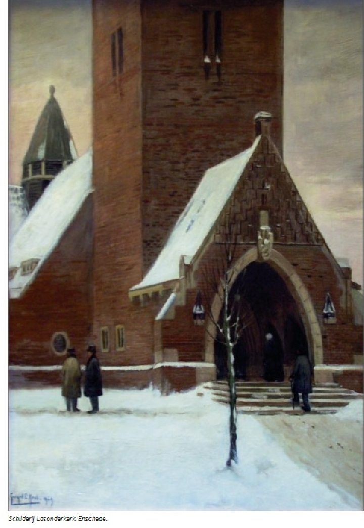 Ik was gistermiddag na de rondleiding door het oude MST aan het Ariensplein ook nog even in het museum Twentse Welle en daar trof ik nog dit schilderij van Gerard Krol aan, waarop de Lasonderkerk staat afgebeeld. Ik heb geprobeerd daarvan een foto te maken, wat mij niet geheel is gelukt. Daarom deze afbeelding van het internet er bij.