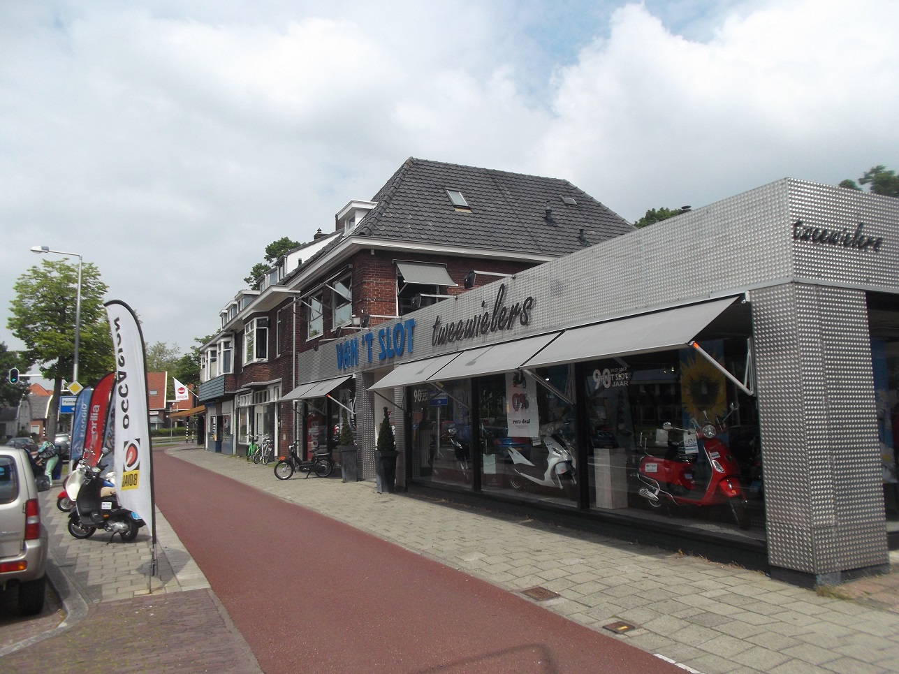 Hierbij nog een recente foto van de fietsenzaak van 't Slot aan de Volksparksingel.Pitr de Nerd schreef:Arie, ik weet dat de oude foto van het slachthuis van 1932 is, maar volgens mijn herinnering zat er rechts naast de “portiersloge” (dat halfronde gebouwtje) een muur. Ik fietste daar tussen 1959 en 1964 dagelijks langs onderweg naar mijn middelbare school. Op die muur stond één of andere anti-eeg leus gekalkt die ze er niet afkregen omdat de verf in de (poreuze) steen was getrokken. Iets van EEG NEE of zo. Recht ertegenover lag (of ligt misschien nog) de fietsenzaak van Van’t Slot waar wij onze fietsen kochten. Prachtig, zo’n ouwe foto. Ik woon al meer dan dertig jaar niet in Enschede, maar sommige dingen blijven je bij.