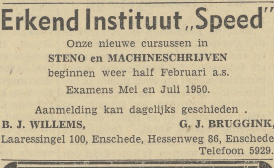 Bruggink, G.J. Assur. en erk.inst.Speed, steno, typen, Ned.taal en kantooropl., Hessenweg 86