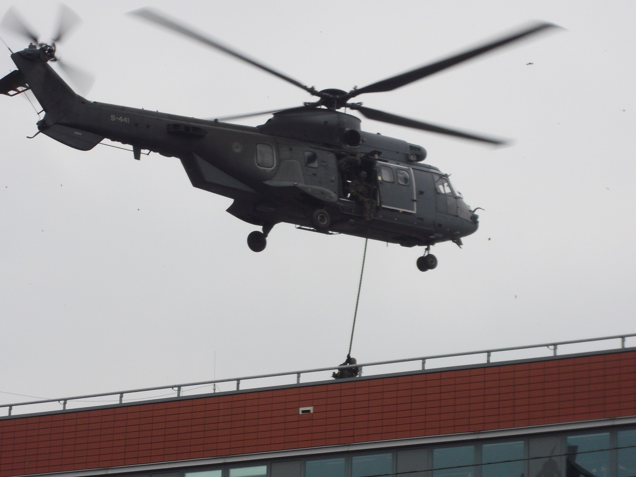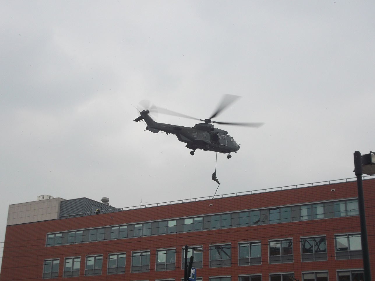 Vandaag even een kijkje genomen bij de militaire oefening met de naam Cerberus Guard in en rondom de Grolsch Veste. Ik heb me laten vertellen dat het een calamiteitenoefening is. In het stadion wordt een bommelding nagebootst. Op het dak van het Dienstencentrum van het Ministerie van Defensie aan het Colosseum werden enkele militairen per helikopter via een touw naar beneden gelaten. Ik heb hiervan enkele foto's gemaakt: