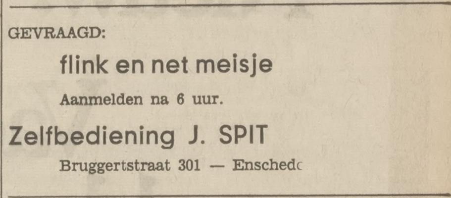 Spit J. kruidenier Bruggertsteeg 183 advertentie Twentsche Courant 9-9-1953 later Bruggertstraat 301 zelfbediening J. Spit advertentie 7-6-1969 overlijdensadvertentie Tubantia 29-1-1963