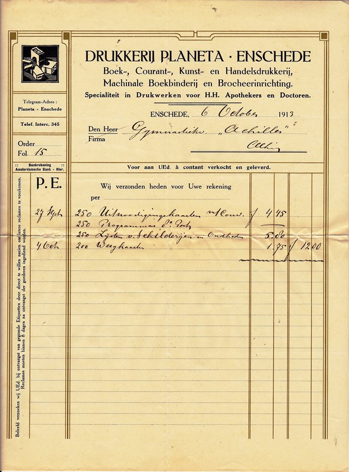 Het is mij gelukt enige dagen geleden een grote partij facturen te verkrijgen van vele Enschedese bedrijven. Grotendeels afkomstig uit de administratie van de Fabrieksschool beslaan de stukken ca. 1869-1922. De grootste nadruk ligt op de periode rond de eeuwwisseling. Tevens had ik al enige stukken in bezit, via andere weg verkregen en oorspronkelijk hoogstwaarschijnlijk tot hetzelfde archief uitmakend. Totaal gaat het om zo'n 170 stuks, waarvan vele exemplaren van dezelfde onderneming. Het aantal aanwezige ondernemingen zal rond de 80 liggen.