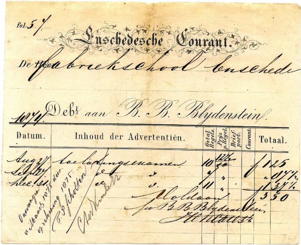 In het bijzonder zijn verschillende exemplaren van B.B. Blijdenstein, H. ter Kuile NGz. en M.J. van der Loeff interessant. Het type factuur of de typografische vorm er van verschilde klaarblijkelijk met relatief grote regelmaat. Voor M.J. van der Loeff gaat het om 4 types tussen januari 1873 en juli 1875. Een andere bekende Enschedese drukkerij, B.B. Blijdenstein, had in dezelfde periode 3 typen in gebruik.