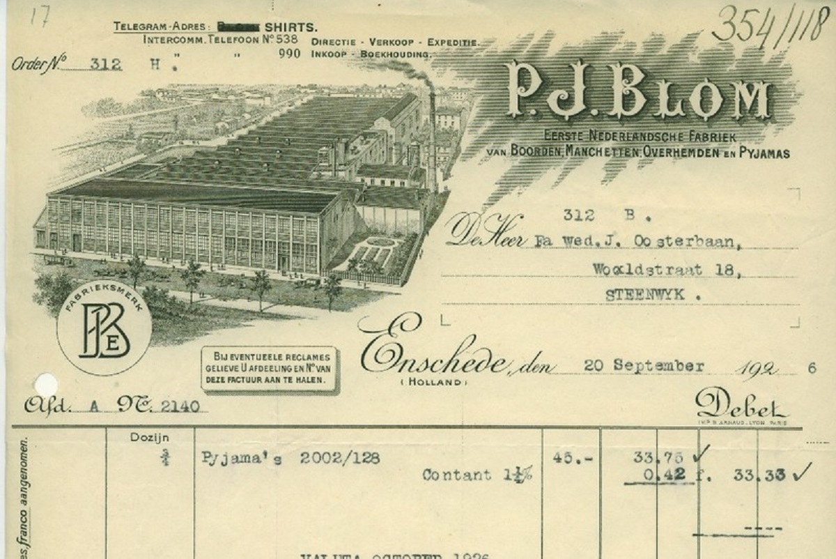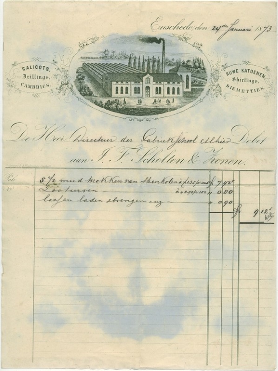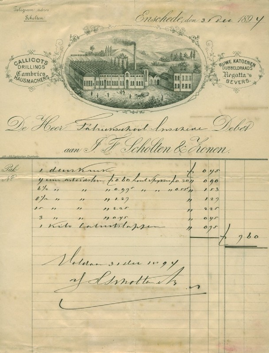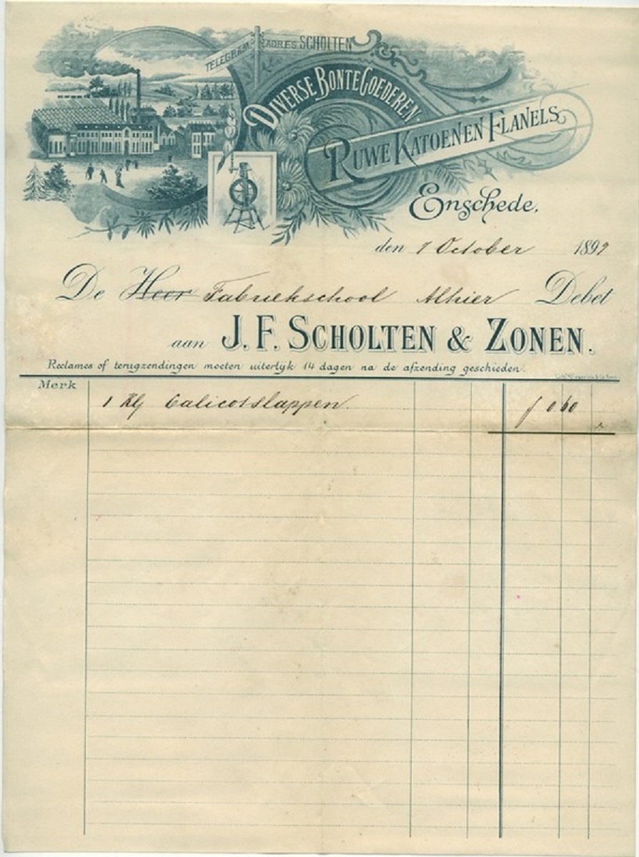 Voor historisch onderzoek zijn de stukken van groot belang. Grotere fabrikanten lieten aan de bovenzijde van de factuur een litho (afbeelding) drukken van hun onderneming. Gezien de vele uitbreidingen waren deze snel achterhaald en volgenden versies elkaar dan ook in snel tempo op. De fabriek van J.F. Scholten & Zonen is hiervan een mooi voorbeeld. Door afbeeldingen uit 1873, 1894, 1899 en 1914 met elkaar te vergelijken kan een voorstelling gemaakt worden van de bouwactiviteiten.