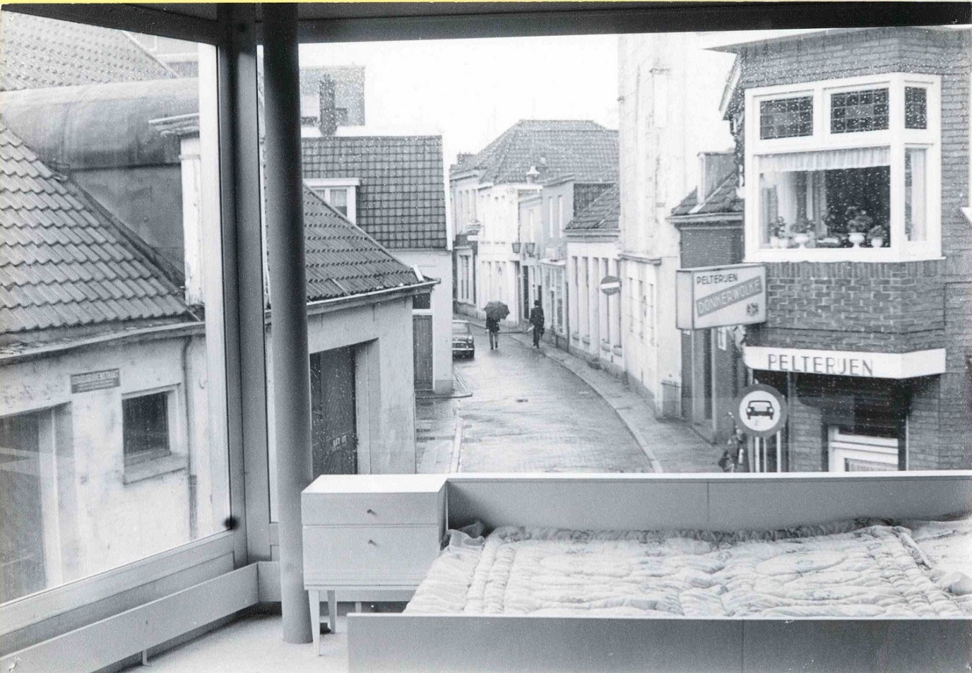 De foto met zicht op de Pelterijen is wel heel bijzonder. Vanuit een als slaapkamer ingericht interieur van een winkel? Welke zaak is dat?