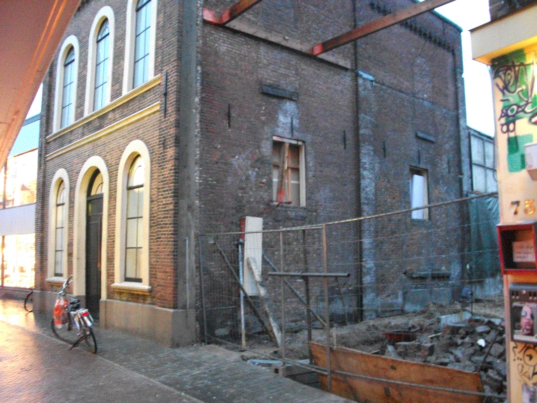 Het wordt helaas gebruikt als voorraadhok in een goedkoop, aftands schuurtje. Ik denk niet die cafés snel geneigd zijn om daar wat aan te doen.Panden aan de Oude Markt hebben de achterkant aan de Stadsgravenstraat. Dat is vaak het vergeten deel van een gebouw