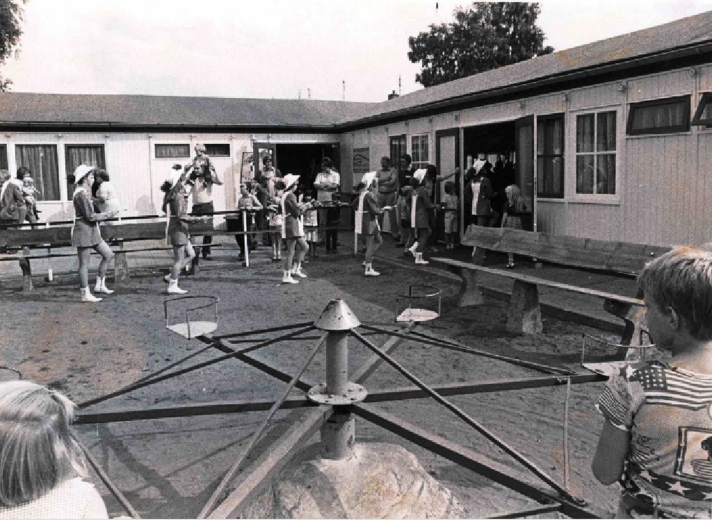 Boekweitstraat 39a Festiviteiten met drumband t.t.v. jubileum speeltuinvereniging Speeltuin Stevenfenne. 1983.