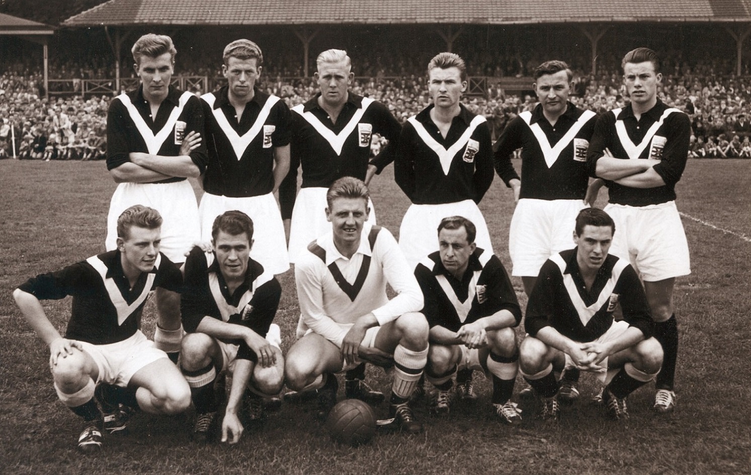 Het elftal van Sportclub Enschede nog in zijn goede jaren in het G.J. van Heekpark met o.m. Abe Lenstra.