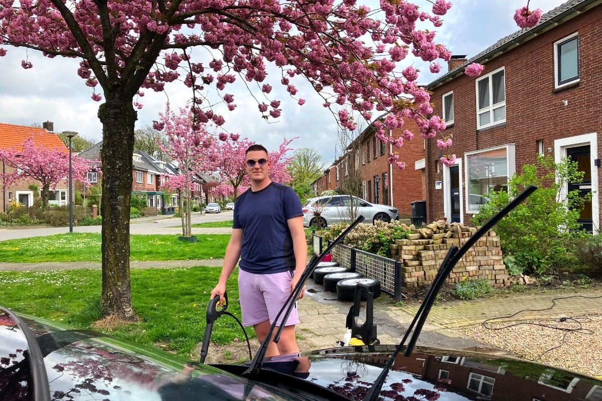 Mart woont al 18 jaar aan de Hoge Boekelerweg. Als we hem aanspreken, is hij zijn auto aan het wassen. “Volgende week wordt-ie APK gekeurd, vandaar.” Onhandige timing, over twee weken zit zijn brandschone bolide weer onder een laag bloesemblaadjes! Mart lacht. “Ja, dan sta ik hier weer. Ach, hoort erbij.”