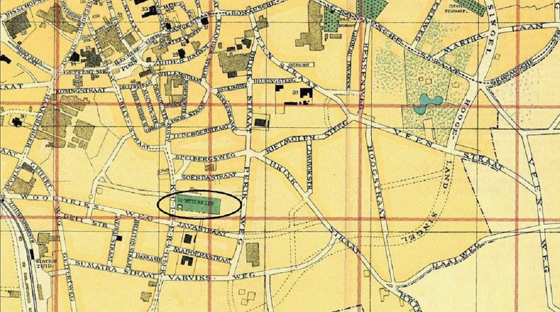 Hoogst waarschijnlijk de plek waar nu het Perikplein ligt. De achterkant van de huizen is niet met zekerheid te zeggen. Of de Javastraat of de Soendastraat. Niet goed meer na te gaan omdat de bombardementen van 1943 en 1944 daar ook z'n sporen heeft nagelaten.