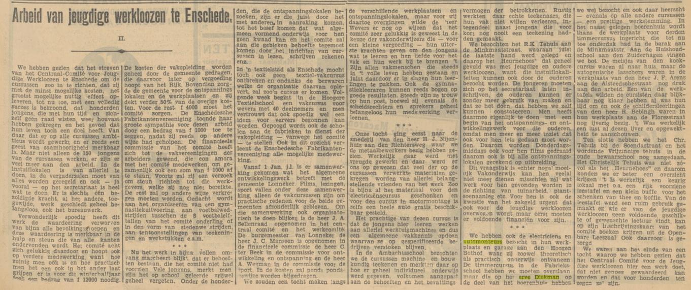 Voor wat betreft de opleiding namens het Centraal-Comité voor jeugdige werklozen op Erve Diekman bij een boerenhuis. zie bijgaand krantenbericht uit de Tubantia van 18-1-1933