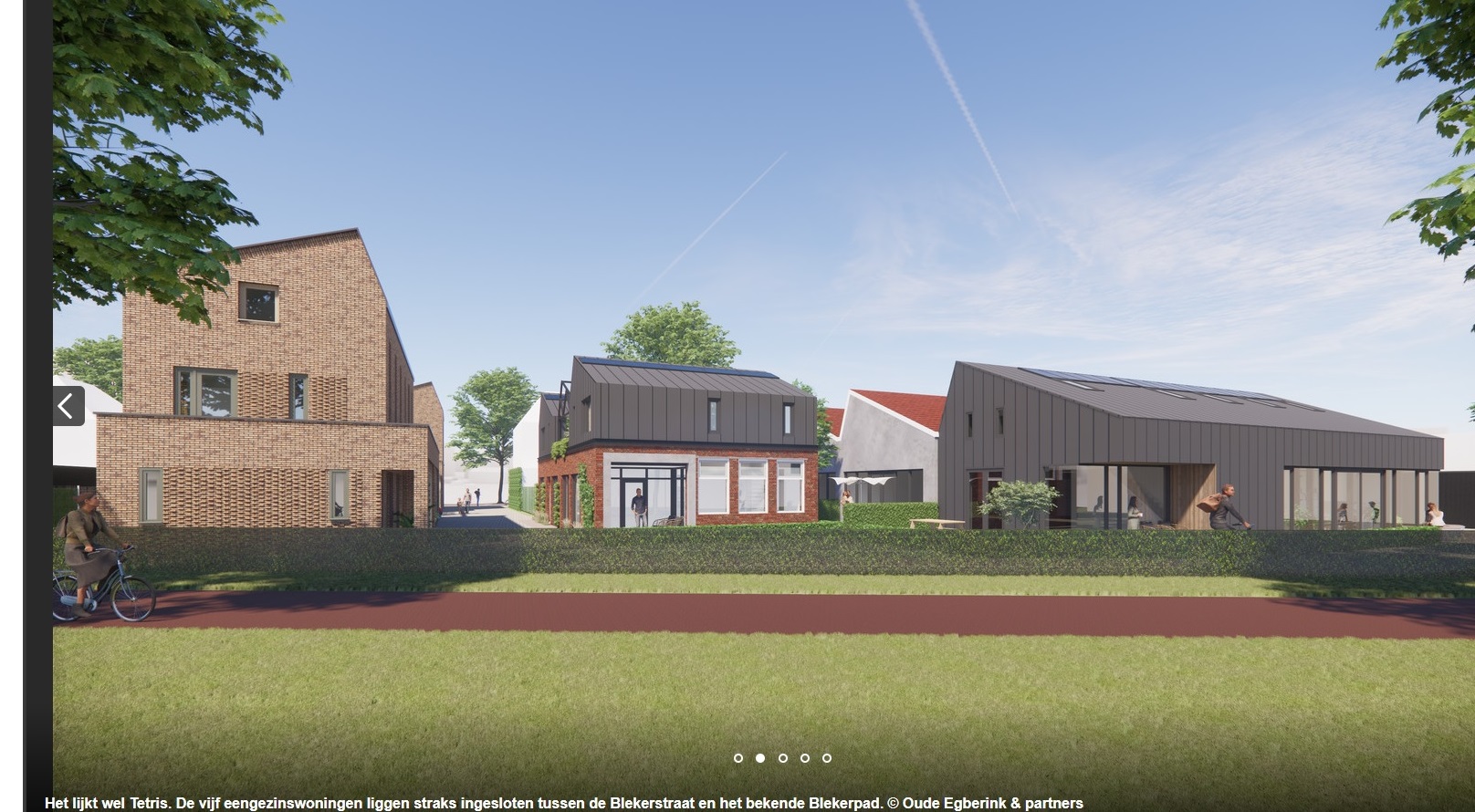 Oude Egberink pakt de bouwtekeningen erbij om het beoogde eindresultaat te laten zien. Dan valt ook direct op wat voor ingewikkelde puzzel hier is gelegd. Het lijkt wel Tetris. De vijf eengezinswoningen liggen straks ingesloten tussen de Blekerstraat en het bekende Blekerpad. Het is geen overzichtelijke lap bouwgrond, maar een wirwar van bestaande en deels gesloopte panden.