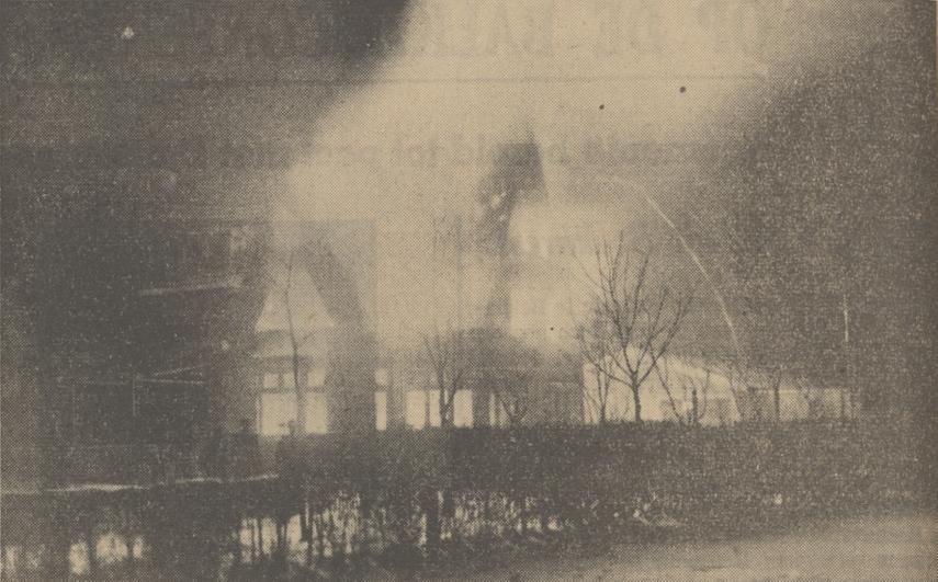 zeer fel eerst om half een kon het blusschingswérk een aanvang nemen, daar 't water over een afstand van 700 a 800 m uit een zwembassin moest worden opgepompt. Inmiddels hadden de vlammen, aangewakkerd door den feilen wind, reeds zodanig huis gehouden, dat van het gedeelte, dat als woning dienst deed, niet veel meer over was dan de kale muren. Het aangrenzende café-restaurant bleef gespaard. De brand is vermoedelijk ontstaan door te hard branden van de centrale verwarming. De eigenaar was verzekerd.
