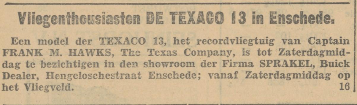 Sprakel heeft al een garagebedrijf aan de (Korte) Hengelosestraat 9 in Enschede. Toch ziet hij kennelijk nieuwe mogelijkheden bij het vliegveld en bouwt ook daar een garage. Een jaar later bouwt hij er 2 huizen bij met een hotel en restaurant.