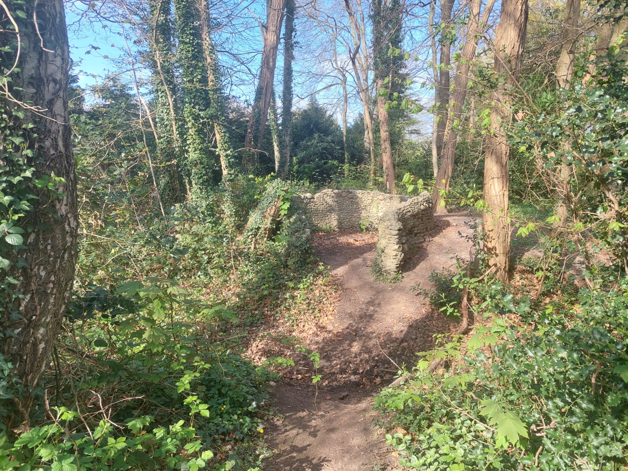 over een bruggetje naar haar prieeltje in het bos. De ‘landweer’ is het restant van dat prieeltje. Bij het verplaatsen