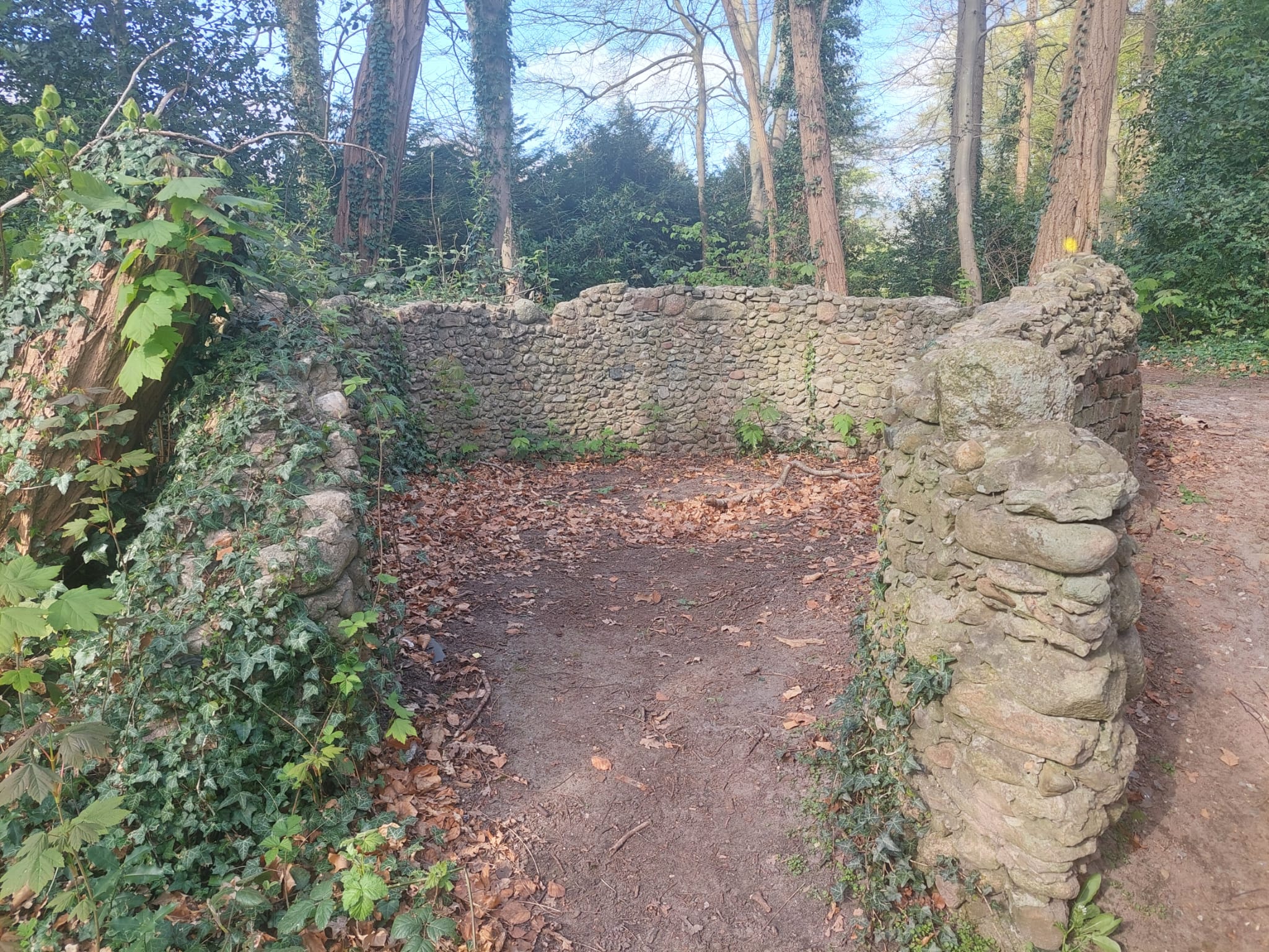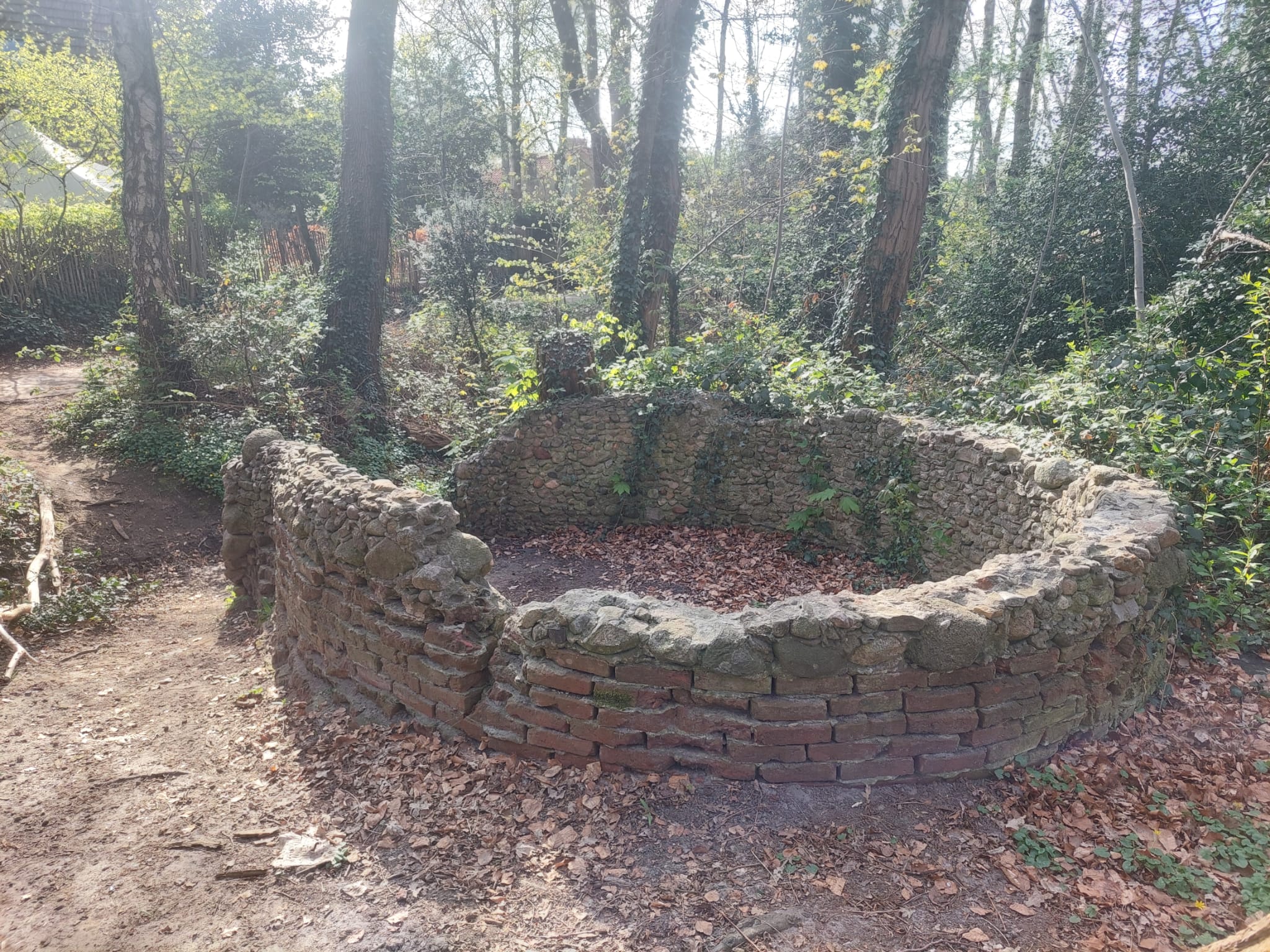 Het gaat over een cirkelvormige stenen muur met een diameter van ongeveer 2,5 meter. Aan de buitenkant is het onderste gedeelte van bakstenen gemaakt. Ook is er een opening aan de kant van het paatje. Ik kan deze kleine ruïne niet in oude kaarten terugvinden, ik kan zelf ook niet zo goed inschatten hoe oud dit is. Het enige waar ik aan kan denken is dat het misschien hoorde bij het erve Kotkamp, of een van de andere omliggende gebouwen te zien op de oude kaarten.