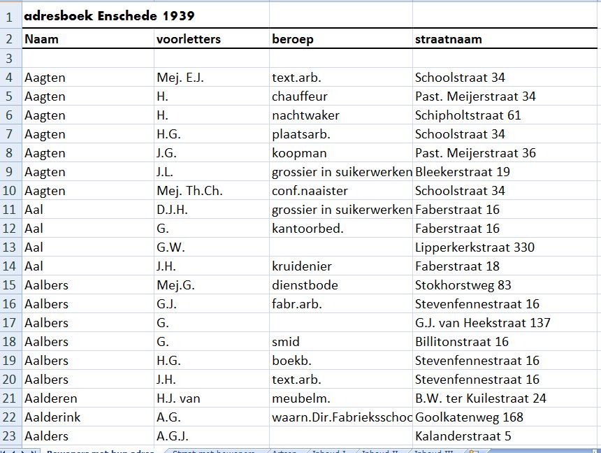 Via via ben ik in het bezit gekomen van een adresboek van Enschede. Hier staan heel veel gegevens van Enschede in maar het belangrijkst is dat er alle bewoners in staan met adres en beroep.